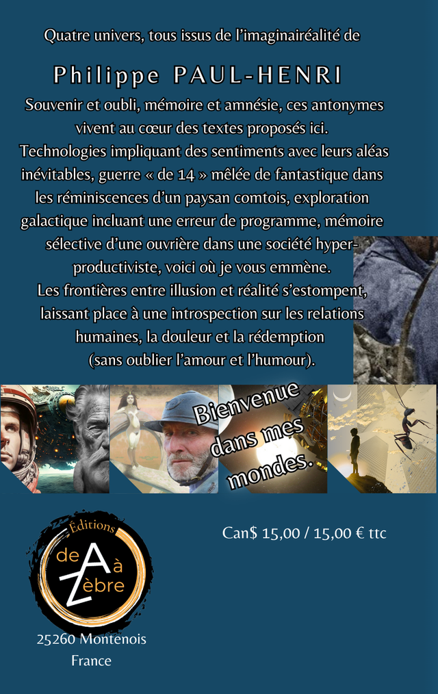 Technologies impliquant des sentiments avec leurs aléas inévitables, guerre « de 14 » mêlée de fantastique dans les réminiscences d’un paysan comtois, exploration galactique incluant une erreur de programme, mémoire sélective d’une ouvrière dans une société hyper-productiviste, voici où je vous emmène.